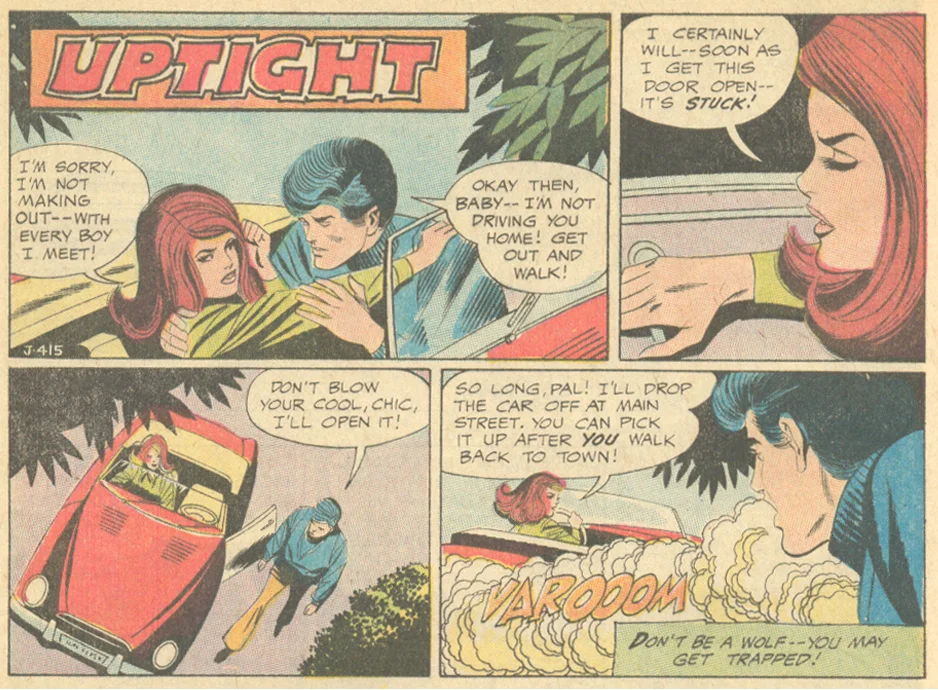Some days are great for curling up and reading full-length romance comic stories. Other days call for short bursts of sequential goodness. Today is one of those days! Below are a few pages of "Uptight" -- well thought out cautionary tales from Lee Elias and Win Mortimer!