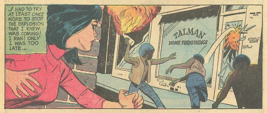 Naturally, the date goes great (this is a romance comic, after all) and Cathy falls in love with Brad. All seems to be going well until one day when the furniture of a family is repossessed by Brad's store. Furious, Cathy gives Brad a piece of her mind. Brad pleads with her to not let "them" come between their love for one another. Just as Cathy reminds Brad that despite the color of their skin, their neighbors are people too -- a brick is hurled through the storefront window. Brad vows to put the Dragons (a gang whom he believes to be the culprits of the attack) in jail.