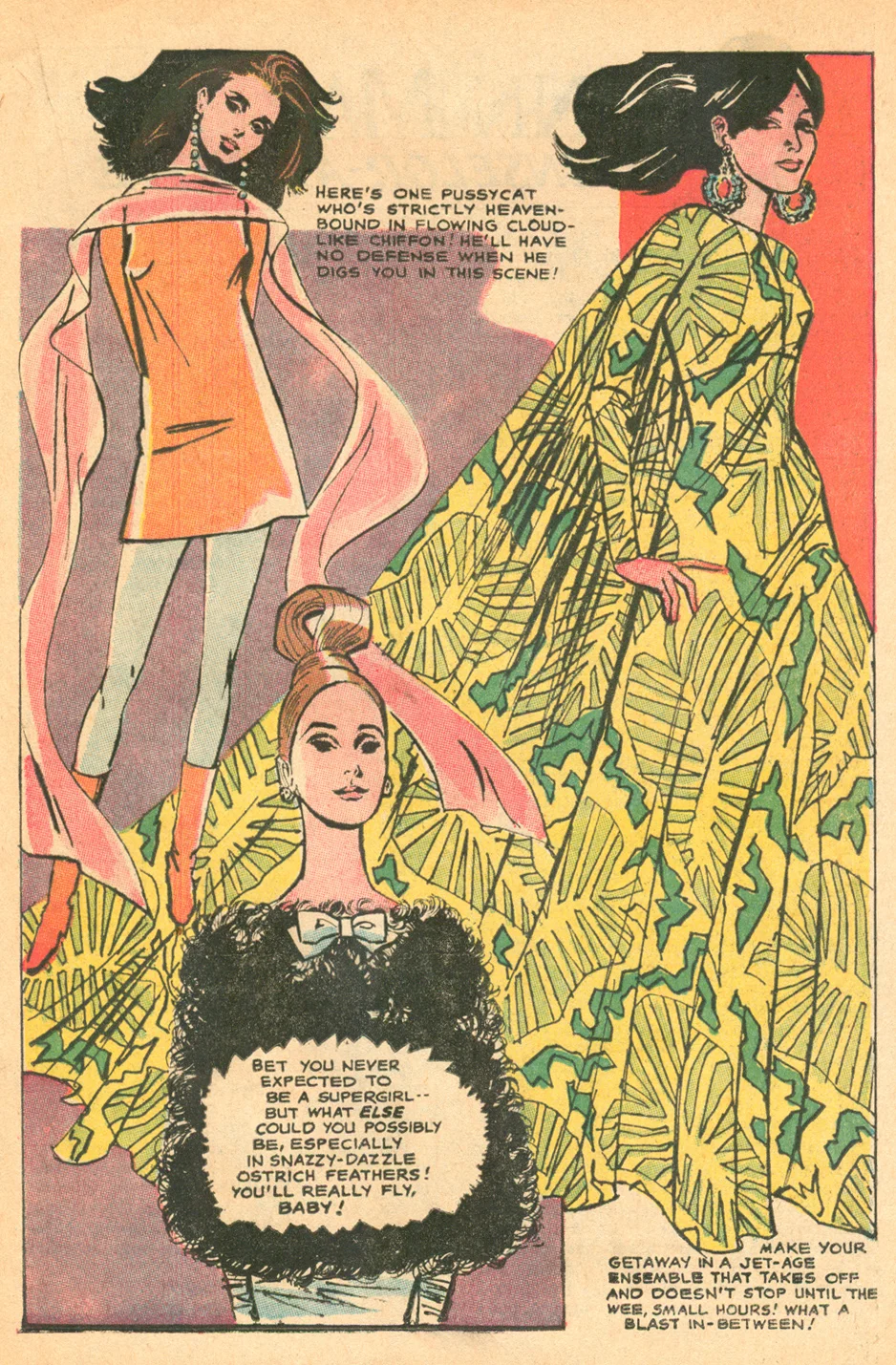 This "Mad Mad Modes for Moderns" from Secret Hearts #118 (March 1967) may be one of my favorites yet. Not only are the fashions (expertly illustrated by Tony Abruzzo) utterly gorgeous and full of sixties mod goodness, but "Holy Hanna!" It's essentially an ad for Batman!